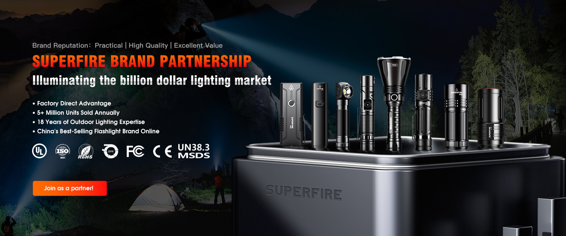 SUPERFIRE specializes in manufacturing a diverse range of illumination products, including flashlights, headlamps, camping lanterns, bicycle lights, work lights, searchlights, solar street lights, uv flashlights, explosion proof flashlights, diving flashlights, and professional lighting solutions for various applications.