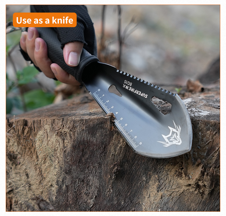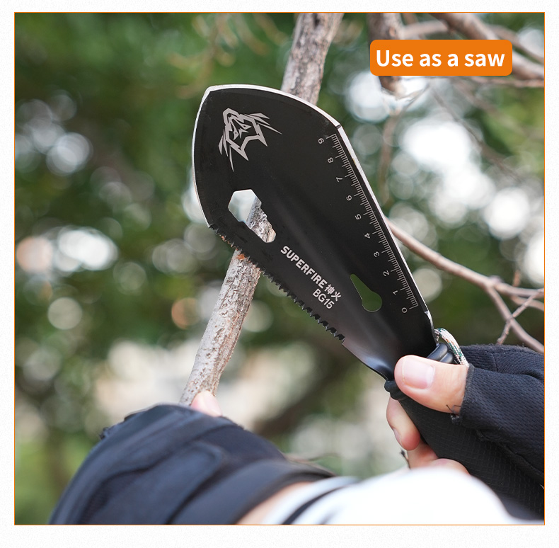 SUPERFIRE BG15 multi-function folding shovel is a high-performance tool with multiple uses. Its unique integrated multi-function design integrates multiple tool functions such as shovel, axe, hoe, saw, bottle opener, screwdriver and knife. It can cope with various scenarios such as camping, hiking, off-road and emergency rescue without carrying a lot of extra equipment. The product is made of high-quality stainless steel, with excellent durability and corrosion resistance, and can maintain stable performance in various harsh environments and extend its service life. At the same time, the shovel adopts a portable folding structure design, which can be easily folded and stored when not in use, and the included storage bag is also easy to carry. In order to meet the diverse needs of different scenarios, it can also be used as a good helper for daily gardening operations, helping to complete small excavation, planting and other tasks. This multi-function folding shovel combines portability, durability and practicality, perfectly interpreting the product concept of "one against many", and is a rare ideal choice for outdoor explorers and practical tool enthusiasts.