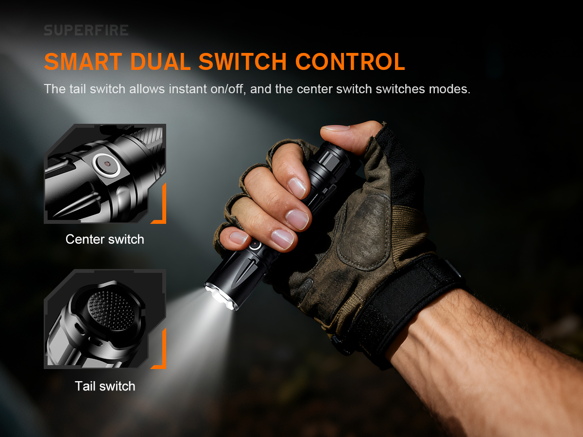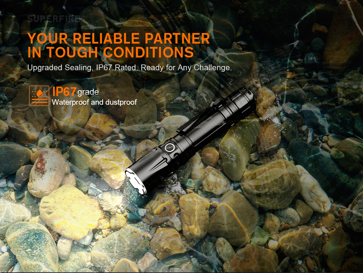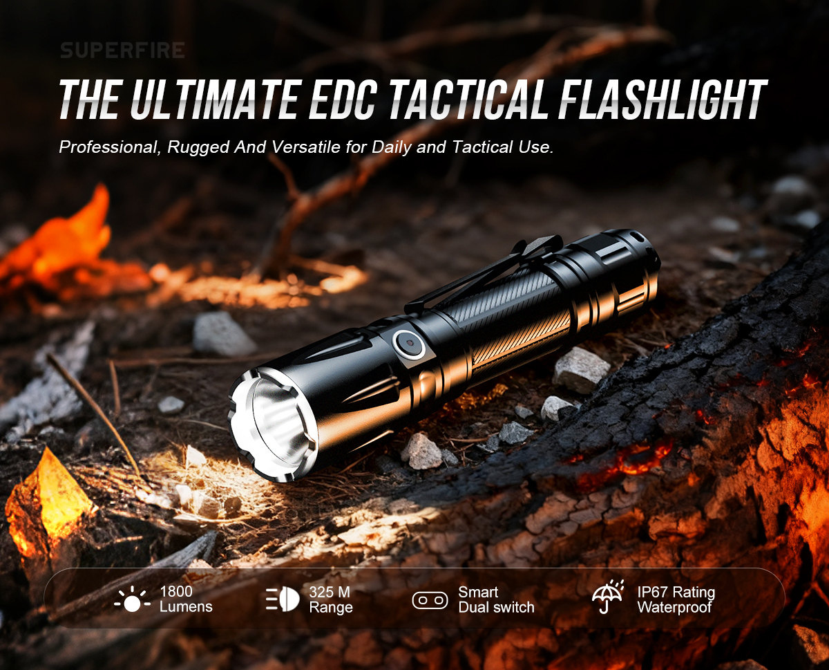 Upgrade to tactical performance with the SUPERFIRE TL01-X. Featuring a tactical tail switch, IP67 waterproofing, 1863 lumens output, and six lighting modes, this is your go-to for professional, outdoor, and emergency missions.