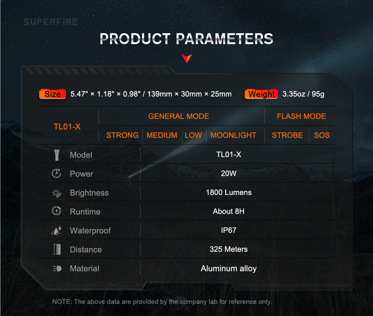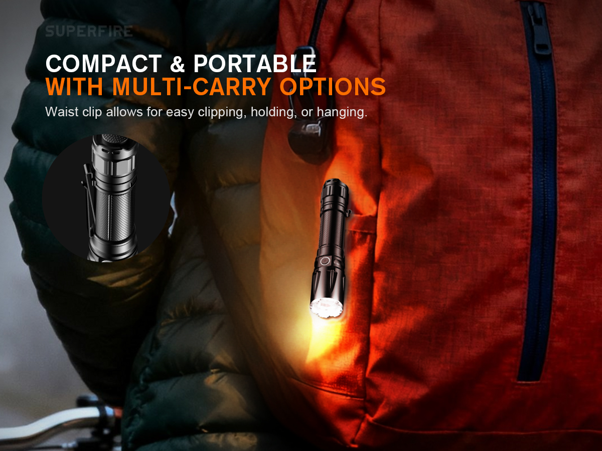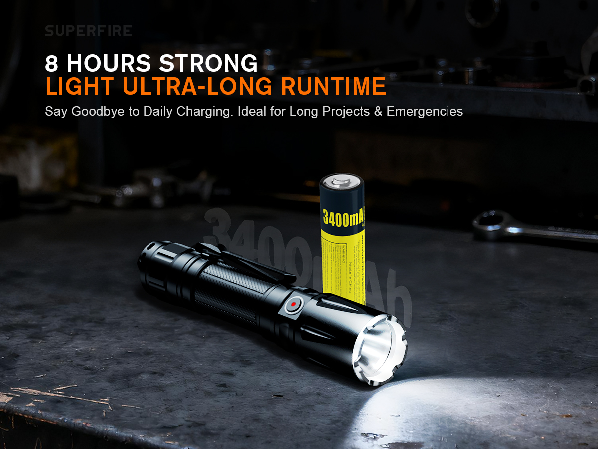 Upgrade to tactical performance with the SUPERFIRE TL01-X. Featuring a tactical tail switch, IP67 waterproofing, 1863 lumens output, and six lighting modes, this is your go-to for professional, outdoor, and emergency missions.